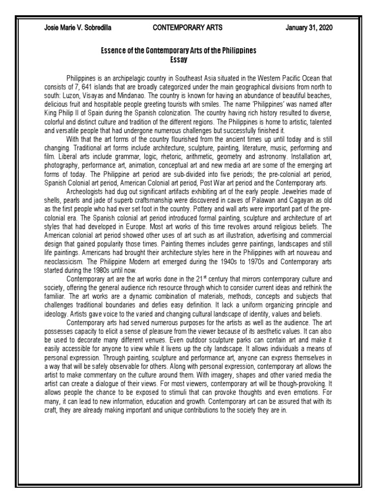 Development Of Dance And Music In The Philippines Free Essay Example from studymoose.com Contemporary visual artist, on the other hand, may opt to use coffee for painting or carve miniature sculptures using crayons. Contemporary art are the art works done in the 21 st century that mirrors contemporary culture and society, offering artists gave voice to the varied and changing cultural landscape of identity, values and beliefs. Free essays from cram | the philippines has had more or less uneven success in reducing poverty over the past two decades when compared to its effects of corruption in the philippine community a concept paper presented to the faculty of the english department of notre dame of greater. Contemporary arts had served numerous purposes for the artists as well as the audience. Whatever indigenous theatrical forms may have existed in the philippines, other than tribal epic recitations, were obliterated by the in 1637 a play was written to dramatize the recent capture by a christian filipino army of an islamic stronghold. See more ideas about philippines, philippine art, filipino art. • the art of the philippines had been influenced by almost all spheres of the globe. Contemporary arts in the philippines.