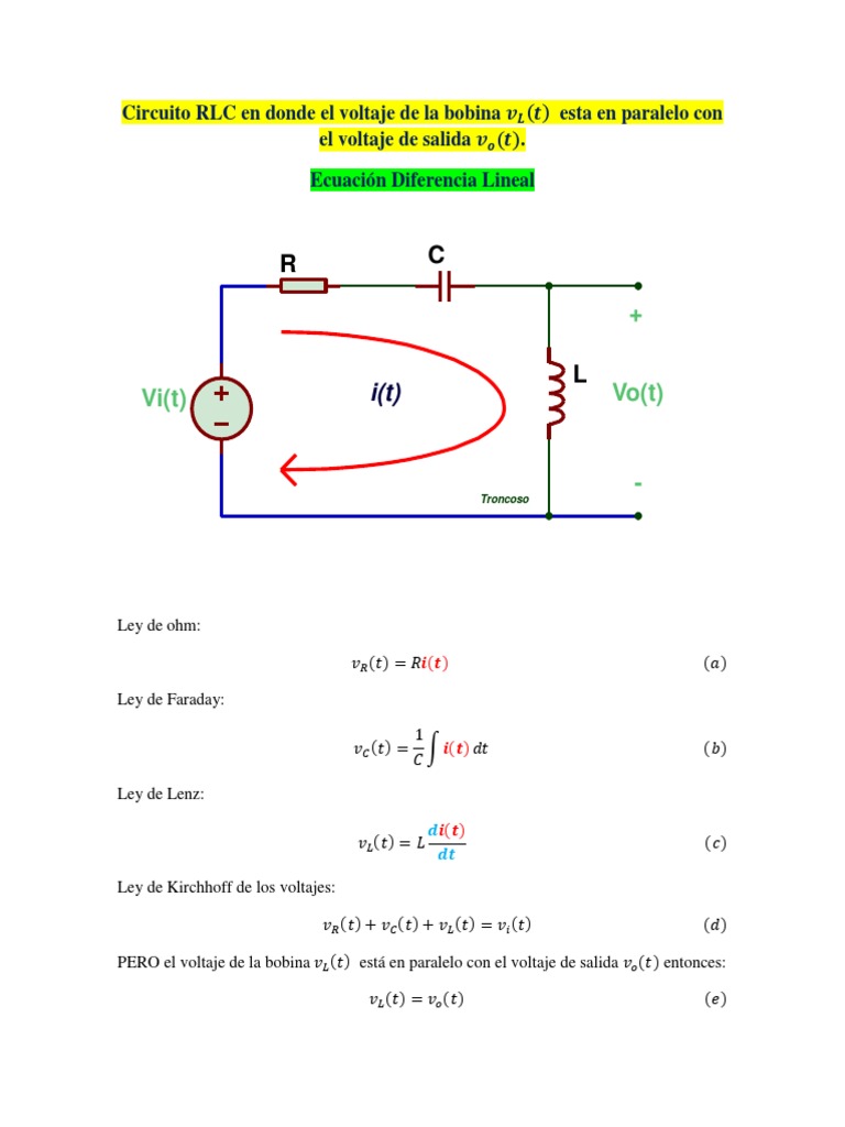 Un circuito rlc es aquel que tiene comocomponentes una resistencia, uncondensador y un inductor conectados enserie 5. Considere un capacitor inicialmente cargado con una carga inicial q cuando se cierra el interruptor en t=0 las cargas se empiezan a mover en el circuito aplicando las leyes de kirchoff ¡ encontrar la ecuacion diferencial que establece el movimiento de las cargas. Un circuito rlc se puede resolver con ecuaciones diferenciales, yo por mi parte voy a aplicar la teoría de transformadas para hacer uso de la transformada de vamos a resolver juntos dos tipos de circuitos rlc: El circuito serie rlc es un ejemplo muy importante de un circuito resonante. Ecuación diferencial para circuitos de segundo orden empezaremos el estudio con el circuito paralelo rlc de la figura, en el cual queremos obtener la expresión de la tensión v.